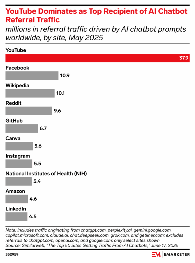 As AI becomes more embedded in the digital discovery journey, new data reveals a striking shift in where web traffic is going. According to May 2025 data from Similarweb, YouTube is now the top destination for referrals from AI chatbot prompts, drawing over 379 million referral visits. This is more than 3x the amount received by Facebook (10.9M) or Wikipedia (10.1M).